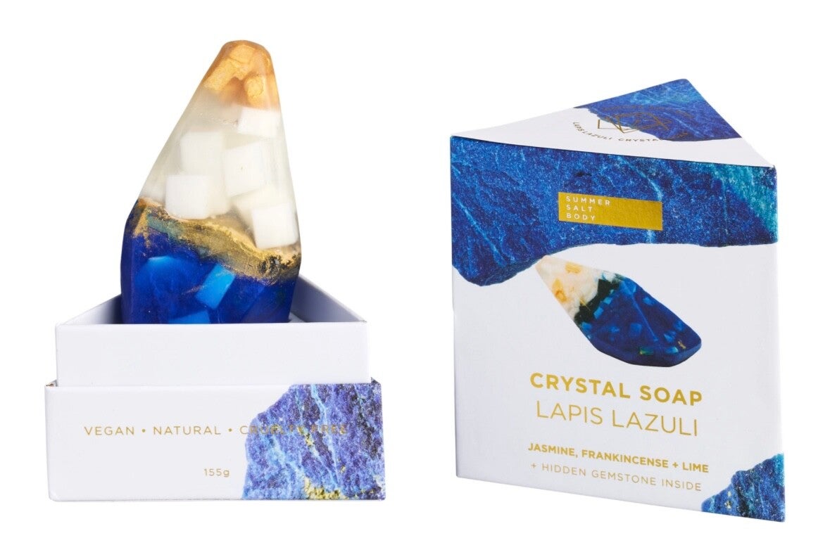 Geïnspireerd door Lapis Lazuli, is deze kristalzeep een luxe manier om je huid te wassen en te reinigen. Bekend als de steen van transformatie, eerlijkheid, zelfbewustzijn en mystiek. Lapis Lazuli staat bekend om zijn hoge vibratie-energie en spirituele potentieel. Het herinnert ons eraan om verantwoordelijkheid te nemen voor onze eigen keuzes en te leren van het verleden. INGREDIËNTEN Aqua, sorbitol, sucrose, zonnebloemolie, glycerine, stearinezuur, kokosolie, etherische olie van jasmijn, etherische olie van wierook, etherische olie van limoen, propyleenglycol (voedingskwaliteit), blauw 4 (CI 42090), bronspoeder (CI 774400).